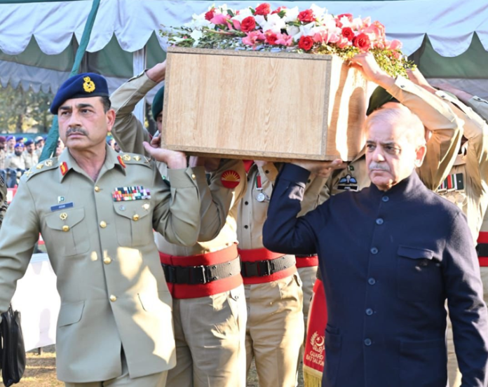 ISLAMABAD: Prime Minister Shehbaz Sharif and Chief of Army Staff General Asim Munir atteded the funeral prayers for three Rangers officials who embraced martyrdom during ongoing PTI protests. The Funeral prayers took place at Chaklala Garrison and wa...