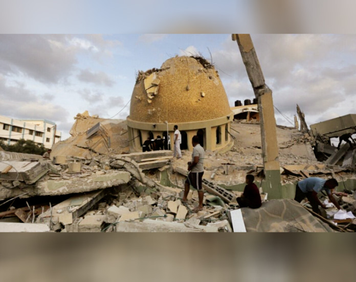 Gaza: Arab media reported that 13 Palestinians were martyred and dozens injured in an Israeli attack on Bilal Bin Rabah Mosque of Deir al-Bila in central Gaza. Many houses adjacent to masjid were also completely destroyed by Israeli bombardment. Eyew...